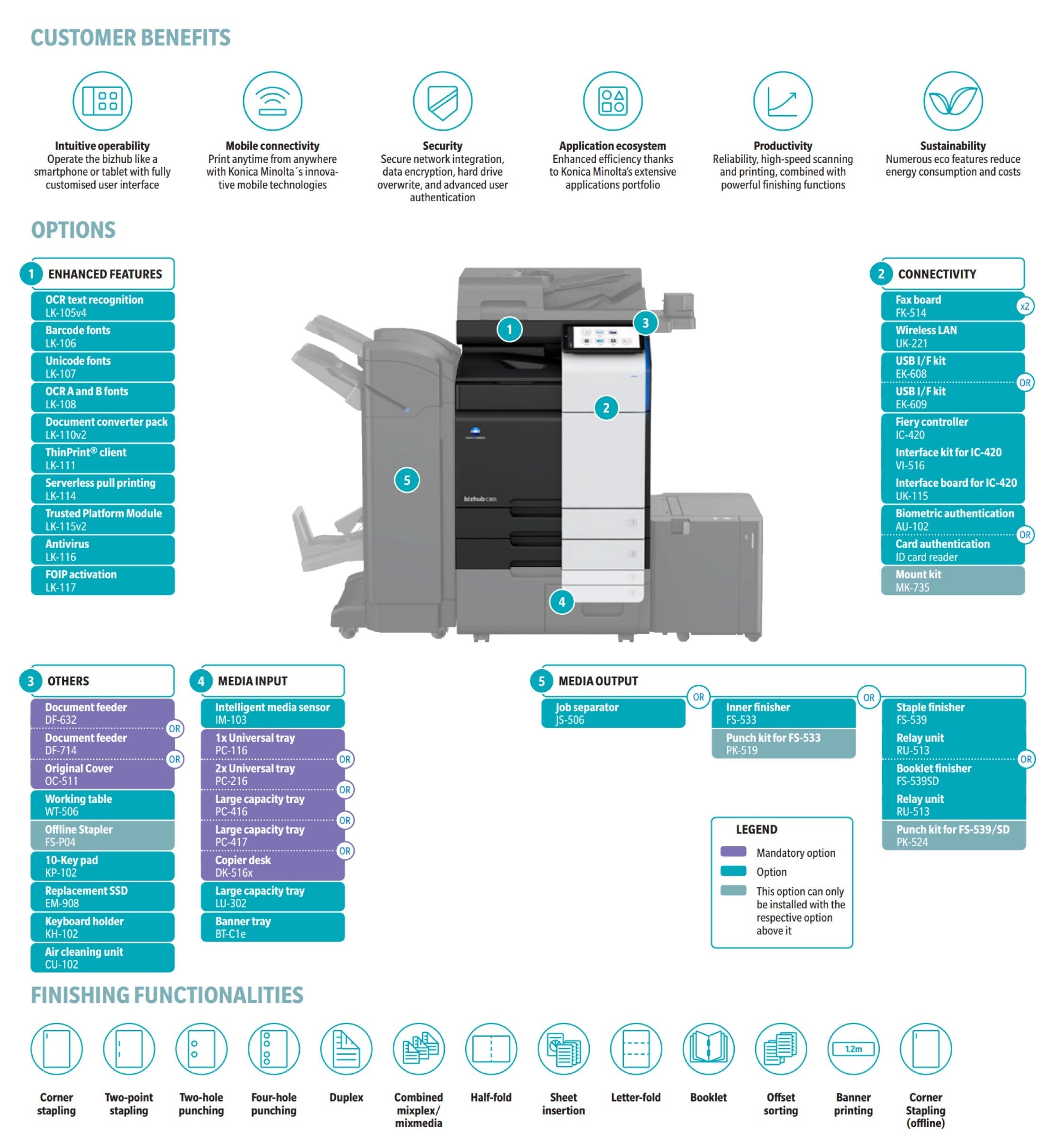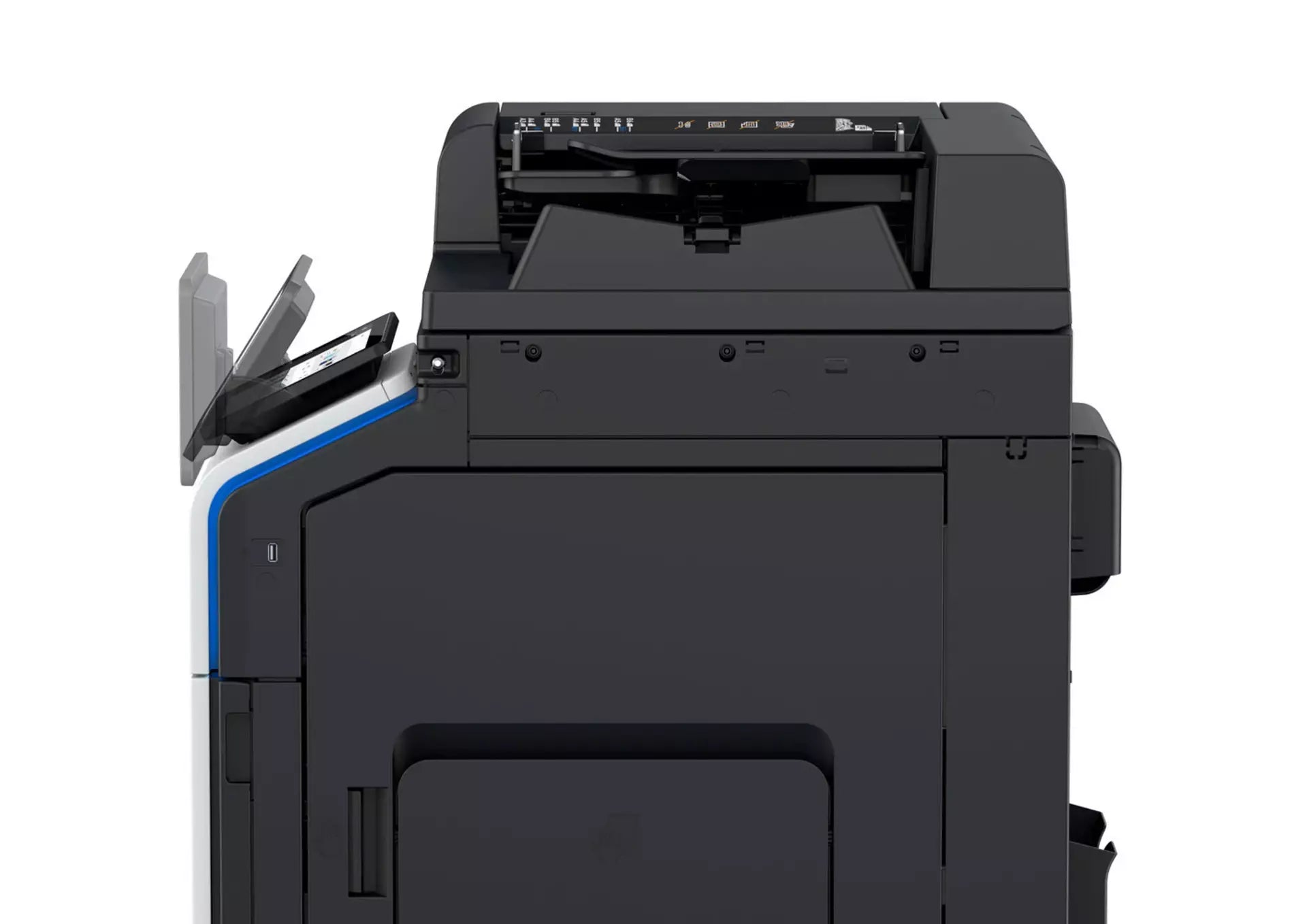 Standard print controller, 2x500 sheets paper cassette, 100 sheet bypass, HDD SDD 250GB, Duplex, 30 pages per minute, 10.1 inch panel. Integrate with Papercut, Print from anywhere, Add applications with Konica Minolta Marketplace, Dropbox, Google Drive, OneDrive, SharePoint connectors. Advanced security, Users authentication with passwords, cards, biometrics, connect with voice.